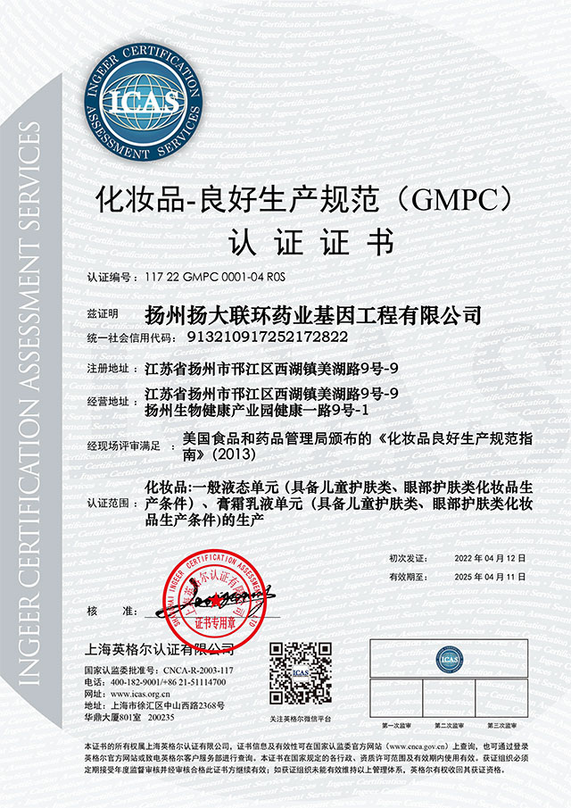 GMPC是一项在全球化妆品领域极具公信力和认可度的专业质量认证标准,ISO 22716 是唯一能够符合欧盟化妆品法规的GMP 标准。自认证工作启动以来,联环基因高度重视,上下齐心,按时完成认证要求的落地、验证文件的整理等相关工作。同时,克服疫情带来的影响,采用线上连线、视频认证的方式有效保证了认证进度。